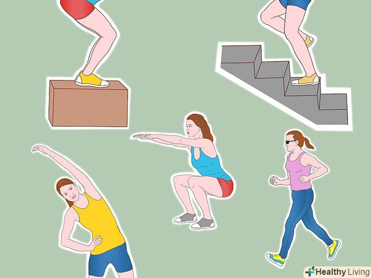Виконайте кардиоупражнения. перш ніж робити шпагат, важливо розігріти м'язи. У цьому Вам допоможуть 15 хвилин занять кардиоупражнениями. Кардиоупражнения бувають найрізноманітнішими, тому Виберіть серед них ті, які вам найбільше подобається, щоб вам не набридло їх виконувати. Що б ви не вибрали, будь то стрибки з розведенням рук і ніг в сторони, біг підтюпцем або ходіння вгору по сходах, вам необхідно розім'яти м'язи і привести їх в готовність для більш інтенсивної активності. [5]- Підвищити інтенсивність зігріває розминки можна стрибками зі скакалкою, присіданнями і стрибками на підставку, які забезпечать приплив крові до ніг.