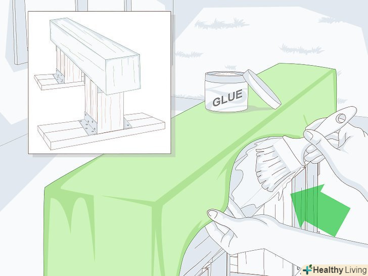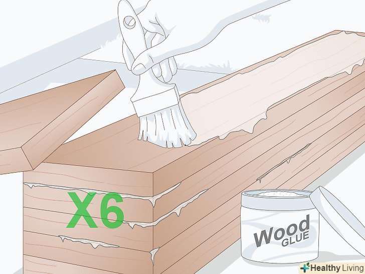 Склейте один з одним, шість 8-ми футових (2,44 м) дощок. розташуйте дошки вертикально, для подальшого накладення один на одного. Змастіть клеєм поздовжню (широку сторону) дошки столярним клеєм (бажано водостійким). [1] , потім, прикладіть наступну дошку поздовжньою стороною. Повторіть аналогічну процедуру для наступних дощок, щоб склеїти їх один з одним. Не шкодуйте клею і ретельно змащуйте дошки, для додання міцності склеюється конструкції. Перед тим, як приступати до наступного етапу, дайте клею висохнути.- Після закінчення цієї роботи, у вас повинен вийти один великий брус, довжиною 8 футів (2,44 м) і шириною 4.5 дюйма (11,5 см).
