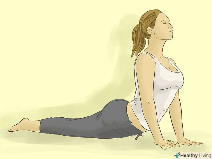 Зробіть елемент "кобра". це поза в йозі, при якій ви розгинаєте спину з положення лежачи на животі. [2]- Ляжте на живіт і покладіть руки на підлогу на ширині плечей долонями біля голови.