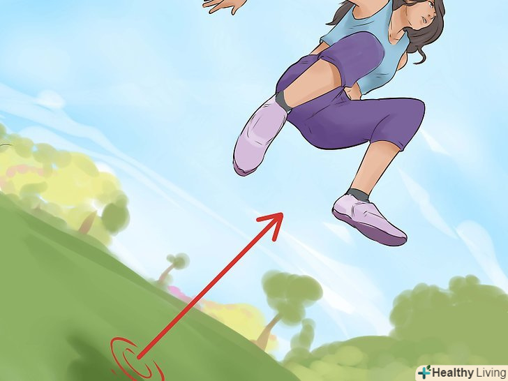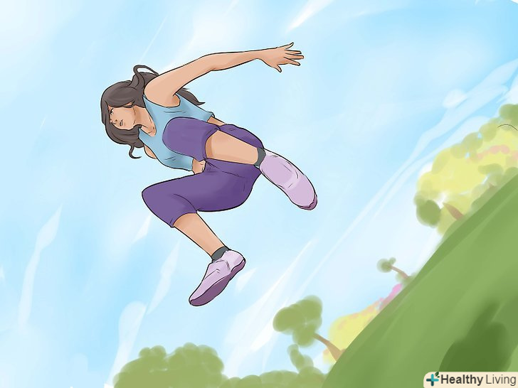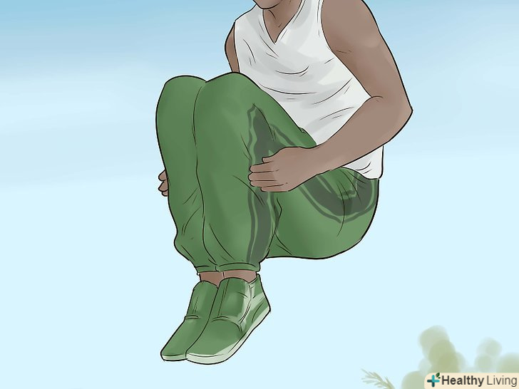 - Комбінуйте вищевказані вправи. Здійсніть розбіг, високо підстрибніть і перекидайтеся (тільки не робіть сальто). У найвищій точці підтягніть коліна до грудей. Немає необхідності хапатися за коліна, але це не забороняється, якщо вам так хочеться.