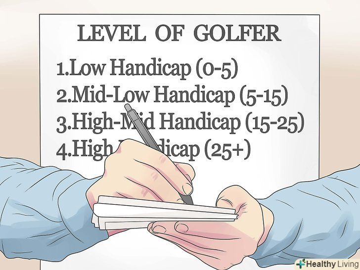 Визначте ваш рівень гри в гольф. перш ніж ви зможете підібрати найбільш підходящий вам набір ключок, ви повинні ознайомитися з термінологією, що описує рівні навичок гри в гольф. Ви, ймовірно, потрапите в одну з наведених нижче категорій.- Низький гандикап (0-5 ударів фори): ви можете виконувати дро і фейди, а також прекрасно розбираєтеся в специфічній механіці, застосовуваної в свінгах. Ви твердо б'єте по м'ячу центром ударяє поверхні ключки.