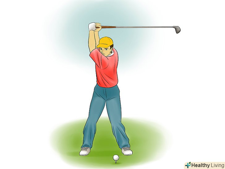 Високо підніміть ключку. продовжуйте виконувати дії, описані в "замаху". Зі зміщенням ваги в бік удару, кисть трохи вигнеться (якщо це правша, то зазвичай це права кисть) і нібито обовьется навколо ручки ключки, вказуючи у напрямку до фарвею, перебуваючи при цьому над головою.