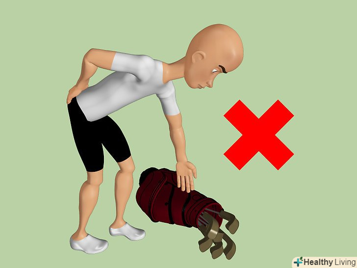 Не штовхайте себе занадто сильно. якщо ви можете управляти тільки декількома лунками спочатку, це краще, ніж жодної. Прислухайтеся до тіла, переміщаючись по полю і робіть перерву, коли вам треба.- Пам'ятайте, нести все приладдя для гольфу треба з обережністю, особливо сумку для ключок. Ви можете закреслити цілий день обережної гри в гольф, якщо будете неправильно нести сумку! Уникайте нахилів, щоб зібрати сумку, використовуйте колісний стенд, який тримає сумку вертикально, або сумку на колесах. Якщо несете сумку на плечах, переконайтеся, що у неї є два ременя, щоб рівномірно розподілити вагу. [2]