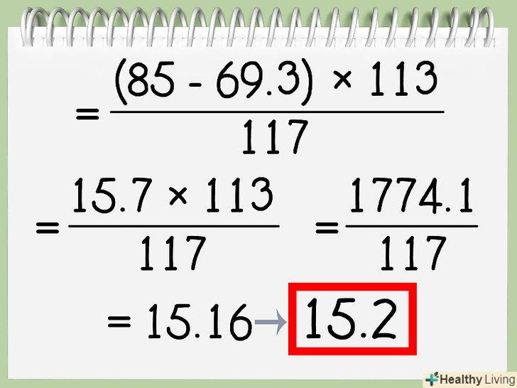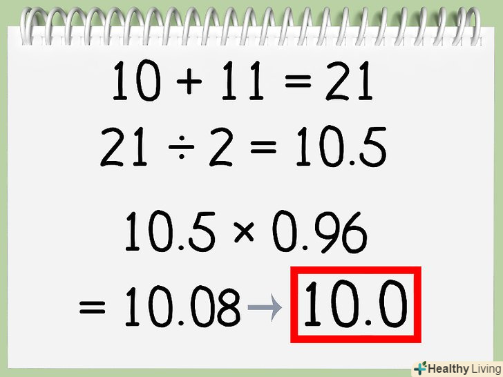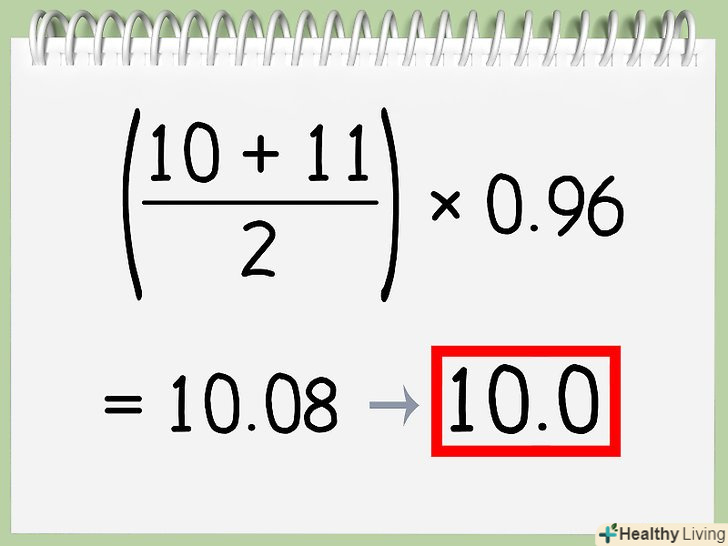 - Наприклад, якщо ви зіграли 8 раундів, ви будете використовувати два найменших диференціала. Припустимо, вони рівні 10 і 11. Усередніть диференціали, склавши їх значення і розділивши отриману суму на 2. Потім помножте отримане значення на 0,96 і округлите результат до десятих. Обчислення будуть виглядати наступним чином: 10 + 11 = 21; 21/2 = 10,5; 10,5 х 0,96 = 10,08. Результат округляємо вниз (до десятих) і отримуємо: 10,0.