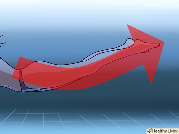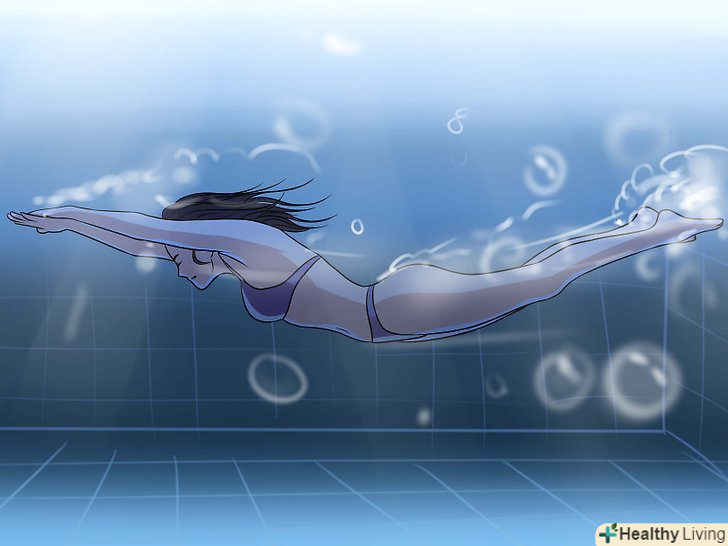 Пливіть дельфіном, щоб просуватися вперед крізь товщу води. такий стиль вважають найефективнішим для підводного плавання. [13] зведіть ступні і ноги разом і злегка зігніть в колінах. Виконайте поштовх обома ногами одночасно, підтримуючи хвильовий рух всім тілом. Пливіть до протилежного боку басейну і періодично виринайте, якщо потрібно набрати повітря.- Сила поштовхів досягається завдяки тому, що ваші ноги рухаються як хлист. Зосередьтеся на тому, щоб повністю розпрямляти ноги для максимальної ефективності. [14]