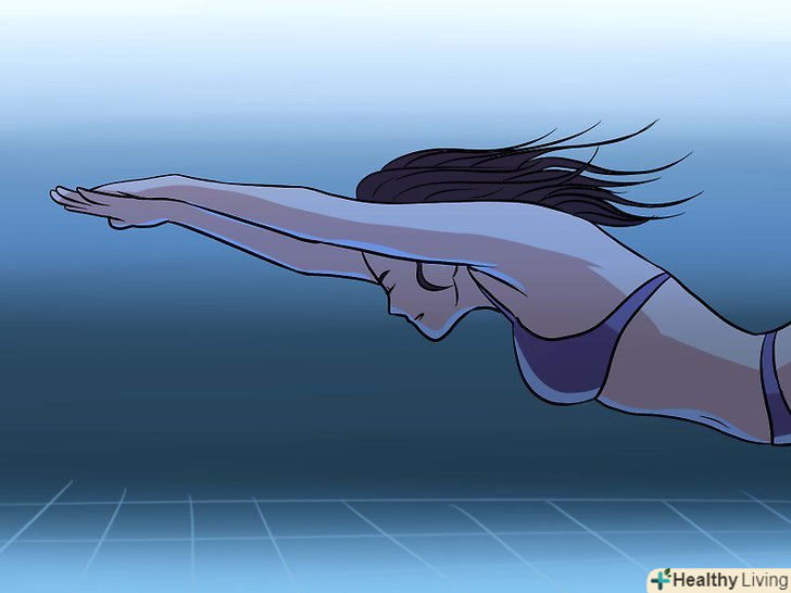 Пориньте під воду у витягнутому положенні. коли опинитеся нижче поверхні води, займіть горизонтальне положення паралельно дну басейну. Ваша голова і очі повинні залишатися в нейтральному положенні обличчям до дна басейну. Підніміть руки над головою і притисніть їх біля вух.