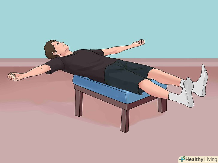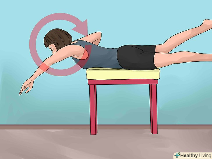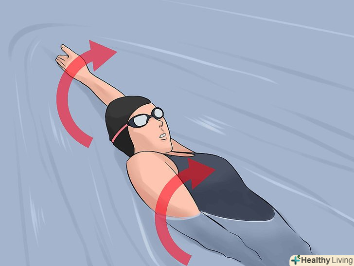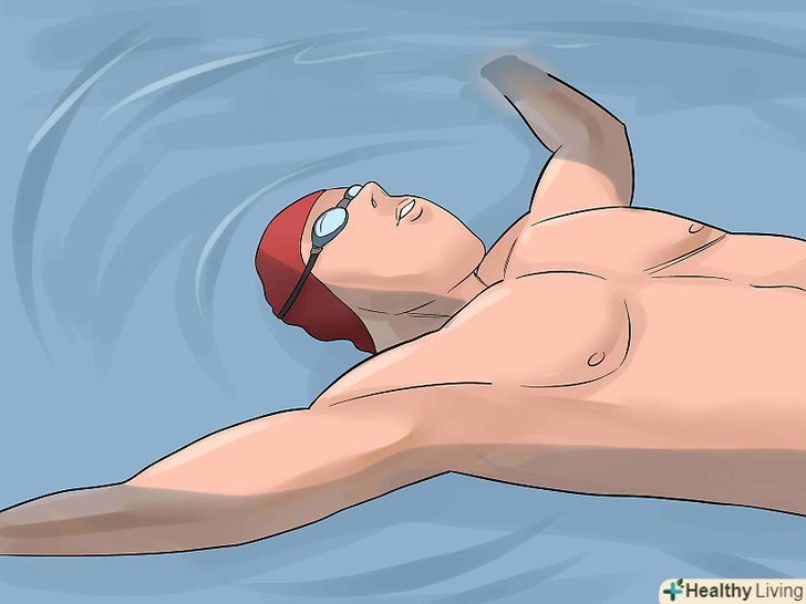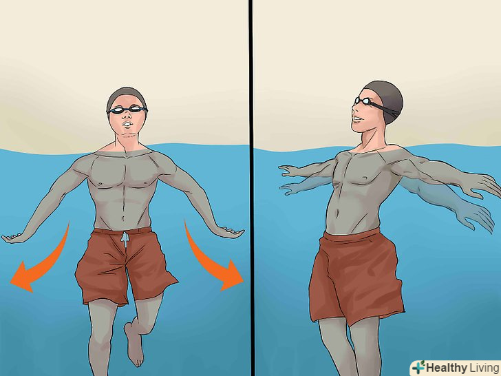 Практикуйтеся на ліжку або на підлозі.- Злегка похитуйте тілом з боку в бік і поверніть голову в сторону, щоб можна було дихати. Це позиція для того, щоб плисти на спині. Витягніть руки в сторони і махайте руками, долоні вниз, відсуваючи руки від стегон.