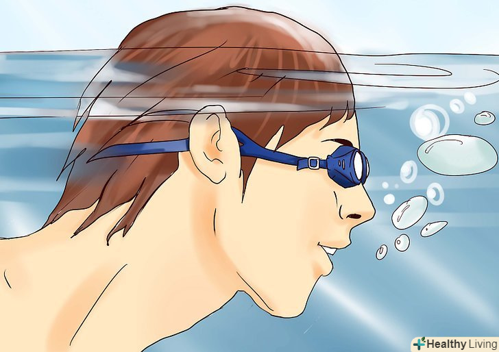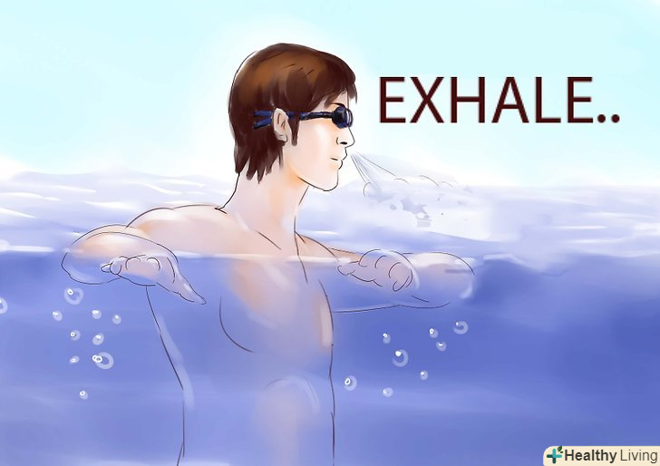 Спробуйте зануритися у воду в окулярах.- Дихайте носом, правильно видихайте. Під водою видихаєте, над водою дихайте ротом.