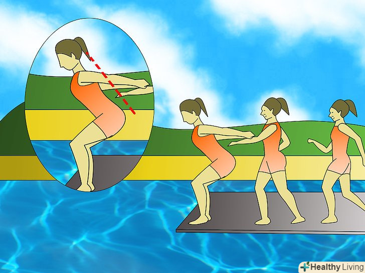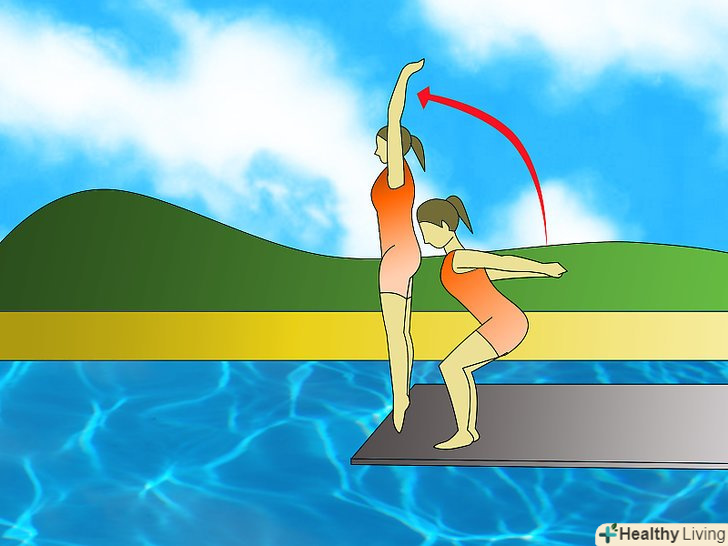 Слідом за стрибком до краю трампліну зробіть велике коло руками проти годинникової стрілки і відштовхніться ступнями від поверхні трампліну якомога сильніше.
