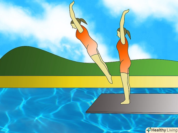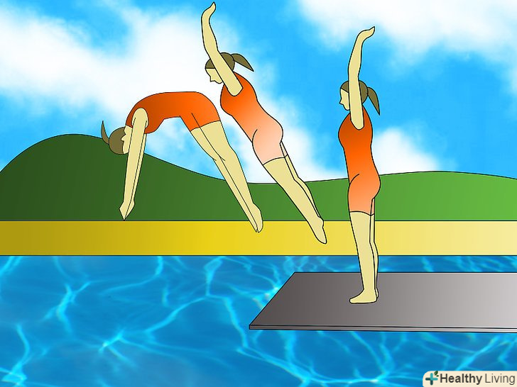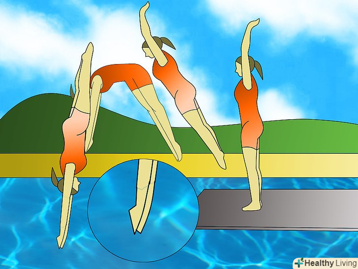 - Якщо ви хочете зістрибнути з трампліну, то дотримуйтесь тих же дій – зігніть ноги в колінах, випрямити руки, тримайте голову прямо, але перед тим, як ви зайдете в воду, витягніть ноги і Зігніть спину аркою, і злегка притисніть підборіддя до грудей.