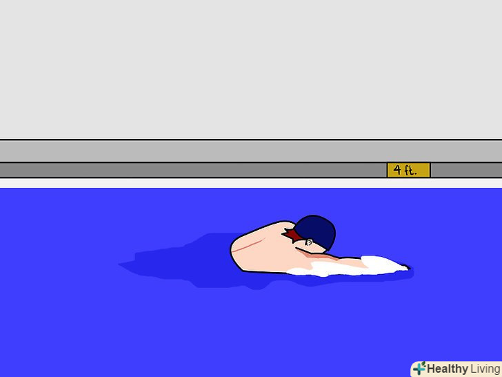 Побувайте в перший раз в глибокій частині басейну разом з учнем. учень, ймовірно, ще не буде готовий там плавати, так що він може переміщатися, тримаючись за бортик басейну. Цілком можливо, що ви дістанетеся до глибокої частини басейну через кілька спроб. У цьому випадку ви повинні вести за собою учня, показуючи, що це безпечно, і кожен раз просуватися трохи далі. Дуже важливо, щоб у учня пройшов страх перед глибокою водою.