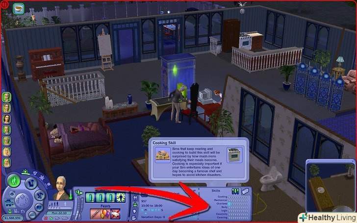 - Кулінарія-це вміння, завдяки якому ваш Сімс може готувати більше страв, це може бути особливо важливо для кар'єри, наприклад, кулінарної. Цей досвід можна збільшити шляхом готування і вивчення кулінарних книг (це можливо, натиснувши на книжкову шафу) і перегляду кулінарних передач по телевізору.