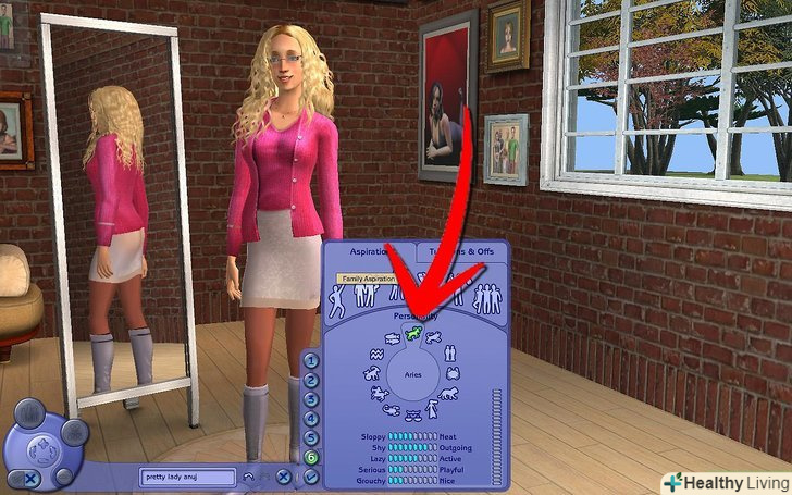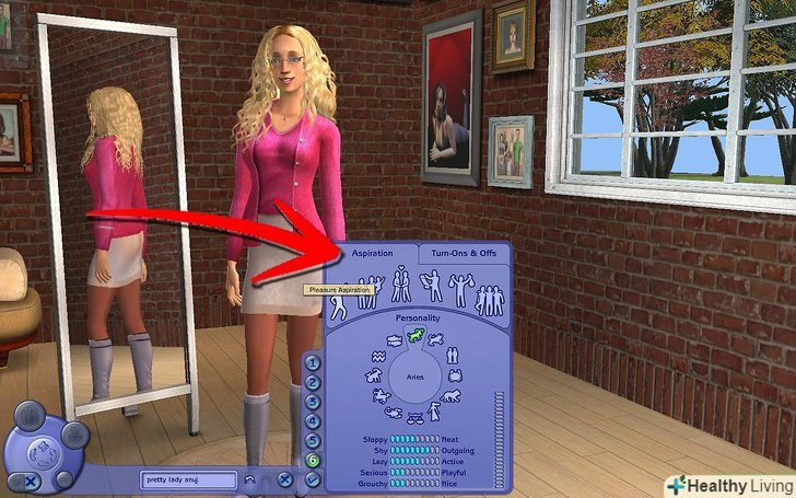 - Виберіть особистість вашому сімсу. Те, як ви розставите рівні особистості сімсу, матиме великий вплив на хід гри. Ваш сим може бути неакуратним або акуратним, сором'язливим або товариським, ледачим або активним, серйозним або грайливим, буркотливим або добрим, і все, що між цим. Рекомендується ставити рівні персональності однаково-5 очок на кожну рису характеру (максимальне число точок -10). Але найкращим варіантом розставлення точок є відображення точок особистості відповідно до прагненням Сімса: наприклад, Сімса з бажанням популярності ви повинні зробити відкритим і товариським, а Сімса з бажанням знань краще зробити серйозним і активним.