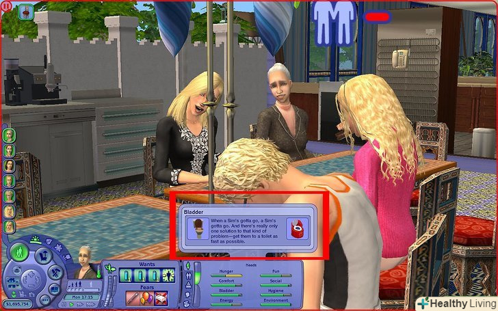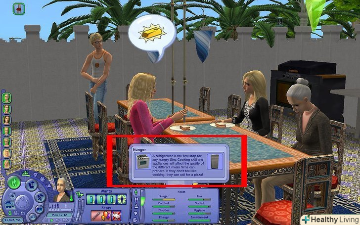 - Голод-головна основна потреба сімсів. Якщо смужка голоду стане червоною, Сімс помре. Щоб задовольнити цю потребу, натисніть на холодильник і виберіть один з варіантів (крім жонглювання пляшками, це взагалі не допоможе). Переконайтеся, що ваш холодильник повний практично завжди.