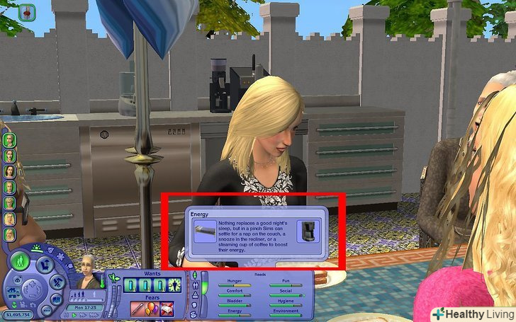 - Енергія-друга за значимістю потреба після голоду. Сімсу потрібна енергія, щоб зробити щось. Виконайте цю потребу, коли Сімс спить або подрімав на дивані. Якщо ця потреба буде занадто низькою, Сімс може втратити свідомість..