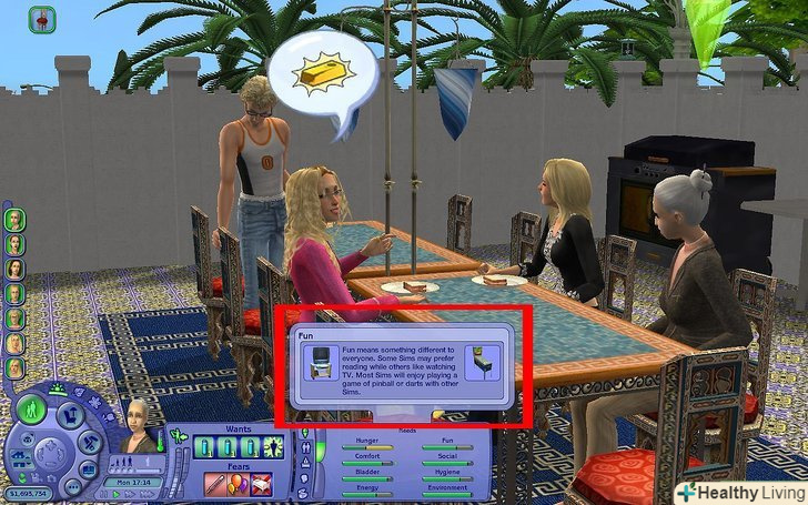 - Веселощі-необхідність Сімса в розвазі. Розважайте сімсів, роблячи що-небудь веселе, дивлячись телевізор, граючи в ігри, читаючи книгу і т.д. рівень веселощів буде дуже низьким під час навчання або роботи.