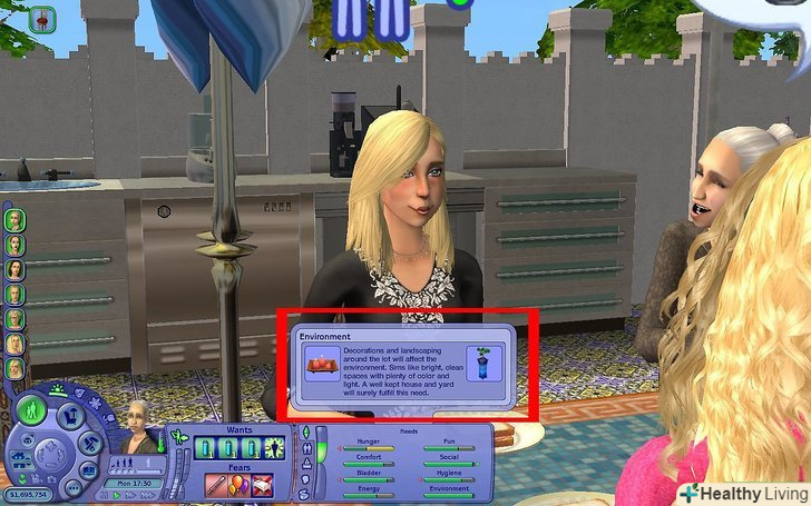 - Навколишнє середовище - ця потреба буде знижуватися і підвищуватися всякий раз, коли Сімси входять в нову кімнату. Щоб виконати цю потребу, прикрасьте будинок, ведіть ГОСПОДАРСТВО, викидайте сміття, розбиті предмети, зіпсовану їжу, а також переконайтеся, що ви поставили вікна в кожну кімнату.