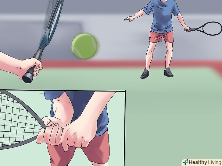 Ефективно вдарте по м'ячу. щоб Ви могли завдати результативного удару форхендом, потрібно, щоб сама ракетка при ударі по м'ячу була правильно розгорнута. Ви можете домогтися цього, відпрацьовуючи кілька простих технік удару форхендом.- Міцно тримайте ракетку. Міцна хватка не дозволить ракетці обертатися, що трапляється, коли м'ячик з силою вдаряється об ракетку і повертає її, що в свою чергу виливається в неточний удари.