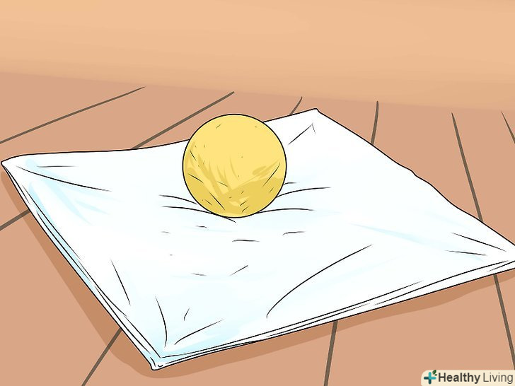Загорніть м'ячик в тканину і підвісьте його. покладіть м'ячик для настільного тенісу на шматок тканини. Оберніть його тканиною, з'єднавши разом всі її кінці, щоб вийшов невеликий мішечок. Повісьте мішечок на цвях або вішалку для одягу, щоб він охолов. Вам знадобиться близько 5-10 хвилин. Хоча м'яч не буде як новий, але він придбає знову округлу форму, і ви зможете використовувати його під час гри.- Якщо ви покладете м'ячик остигати на плоску поверхню, це може привести до утворення вм'ятини з одного боку.
