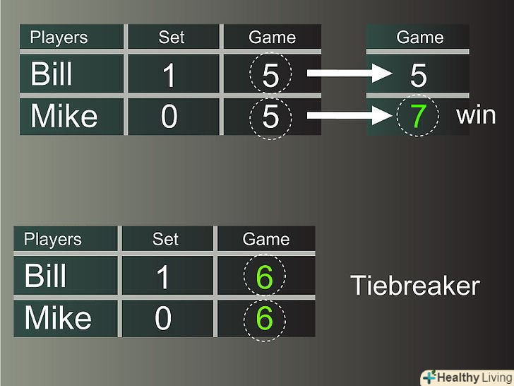 - Тай-брейк грається, якщо обидва гравці виграли по 6 геймів. Його використовують, щоб визначити переможця в сеті. Якщо у обох гравців по 5 виграних геймів, для перемоги в сеті потрібно виграти мінімум 2 гейми поспіль. Якщо рахунок стає по 6, то для визначення переможця в сеті грається тай-брейк.