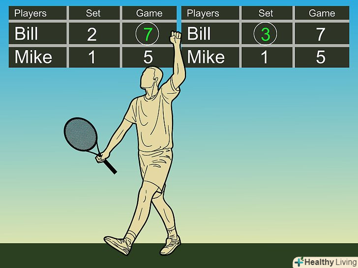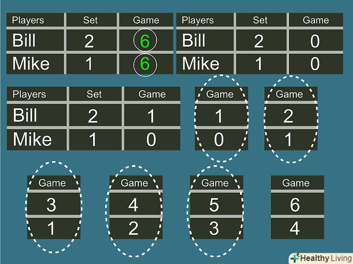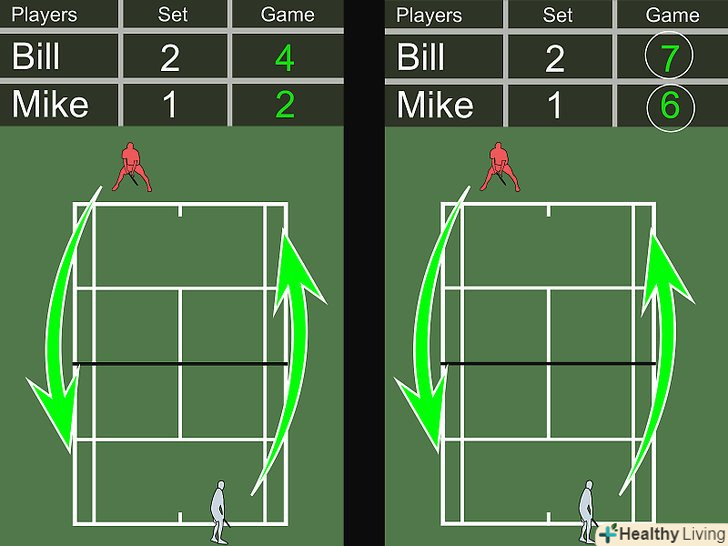 - Перший, хто набере 7 очок і випередить опонента на 2 очки, стає переможцем гейму і сету.