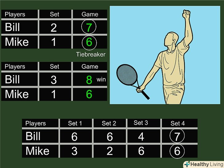 - У деяких матчах грається фінальний сет без тай-брейку, до "переваги в два гейми". Це означає, що гравець повинен виграти 6 геймів і мати перевагу в 2 гейми над суперником. Гра може тривати до тих пір, поки один з гравців не отримає цю перевагу, наприклад, 8 - 6.