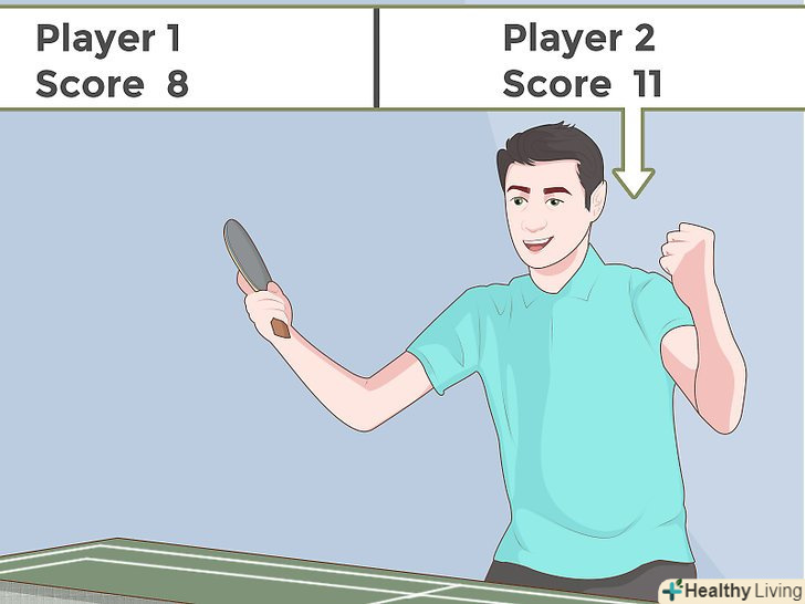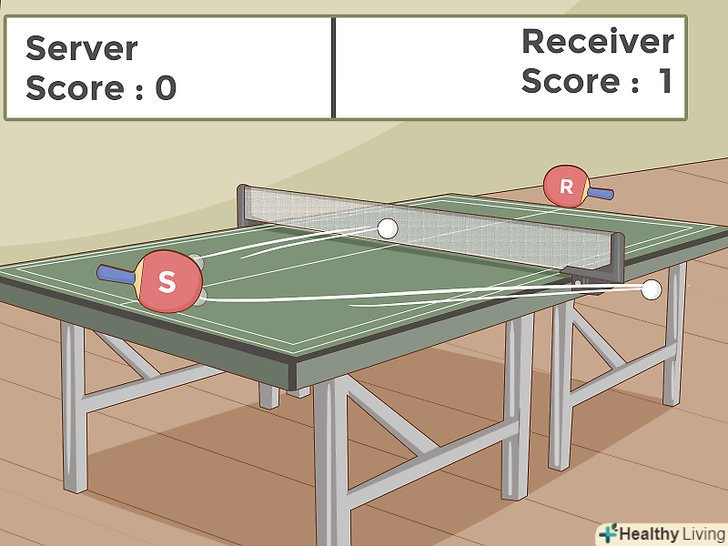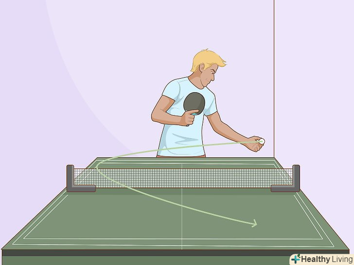 Подача м'яча. М'яч повинен бути кинутий вільною рукою вертикально мінімум на 16 см, а потім по ньому потрібно вдарити ракеткою, щоб він спочатку вдарився об вашу половину столу, а тільки потім пішов через сітку на бік противника.- Якщо ви граєте один, ви можете вибрати будь-яку точку на стороні суперника, а суперник повинен потім повернути м'яч вам назад. Якщо грають двоє, то подачі чергуються між вами і вашим партнером, починаючи з людини по правому флангу, і м'яч повинен відскакувати спочатку в правій половині вашого боку столу, а потім повинен бути доставлені на крос сторону вашого опонента.