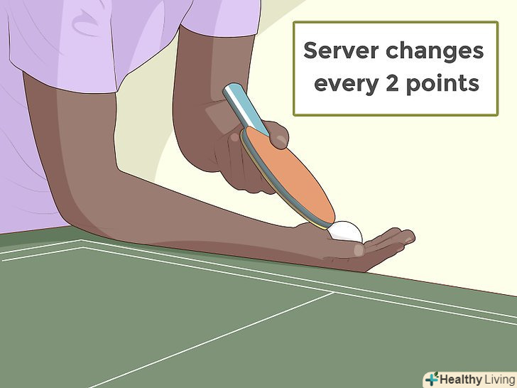 - Подача переходить на іншу сторону кожні два очки. Після двох очок, які закінчилися перемогою, ваш опонент (або в парному розряді, людина з іншого боку столу, що стоїть навскіс від вас) отримує право подачі. Після більше двох очок подає вихідний подає (або в парному розряді, його партнер).