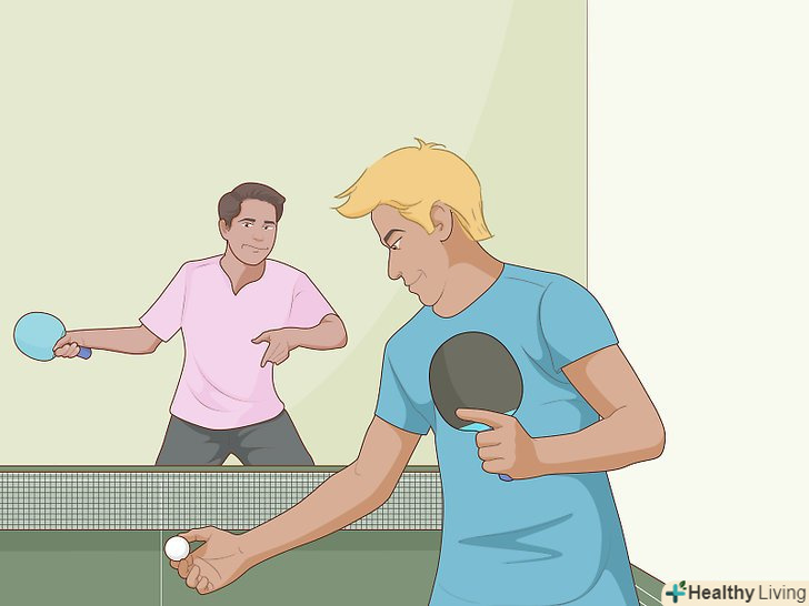 Знайдіть напарника по грі. ви, напевно, хочете почати грати з кимось приблизно вашого рівня і вище і переважно з тими, хто не агресивно конкурентоспроможний. Таким чином, ви можете весело провести час і навчитися грати. Ви можете грати один на один або двома групами по дві людини, як в парному розряді. І вам напевно знадобляться в постійному доступі м'ячі для пінг-понгу, ракетки і стіл, якщо у вас немає постійного доступу до них.lt;bragt;lt;bragt;- Якщо ваша зорово-моторна координація порівнянна з триногою сліпою собакою, ви можете почати практикуватися біля стіни і знайомитися з тим, як м'яч відскакує від стіни і відбивати ракеткою назад. Це найкраще робити за столом навпроти стіни.