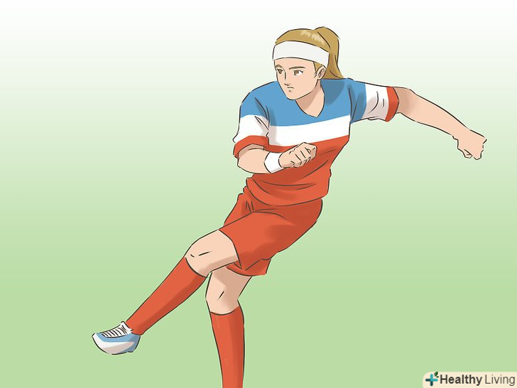 Бийте по м'ячу з підйому. поставте свою неударну ногу в декількох дюймах в стороні від м'яча і бийте його з підйому ударною ногою. Це передбачає кращий контроль над м'ячем, дозволяючи відправити його в точку, яку ви вибрали, а потім в сітку. Завершіть свій ударний рух, ведучи ногу вгору і вказуючи носком, куди хочете послати м'яч.- Деякі гравці люблять використовувати удар шнурівкою, щоб бити по м'ячу з більшою силою, що також є прекрасним способом для удару. Це, як правило, передбачає меншу точність, але більшу силу удару.