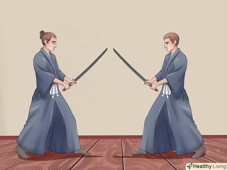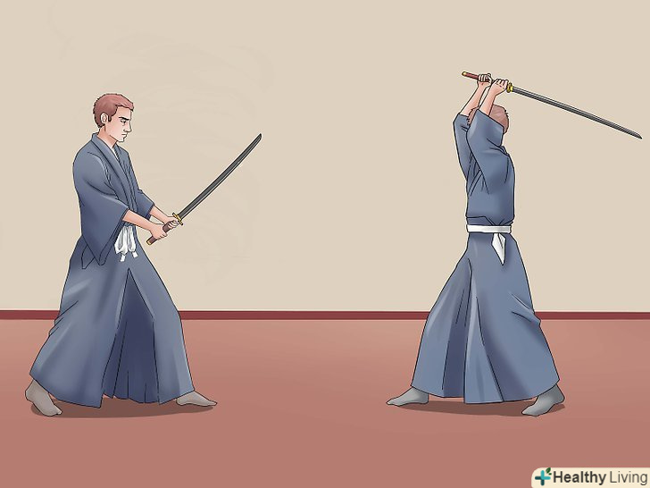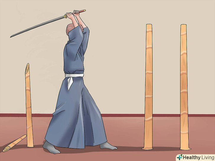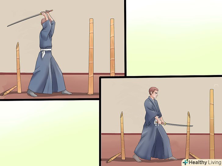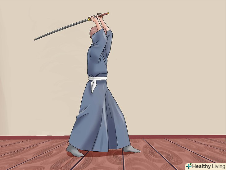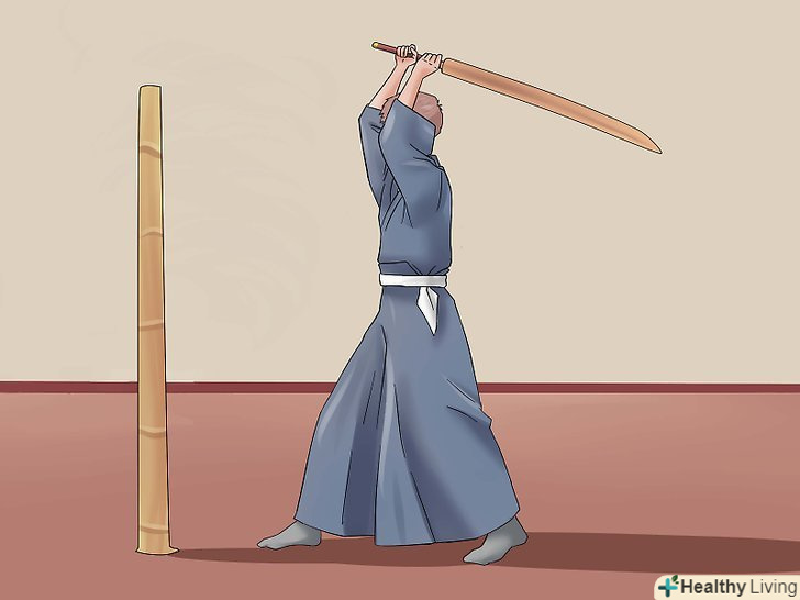 Зробіть перший удар. почніть з центр-захисту з правою опорною ногою. Підніміть меч над головою у верхню позицію, але трохи по-іншому. Махніть мечем вниз і піднесіть рукоять до центру. Це називається Шоменучі (удар, що спускається до голови). Ще можна спробувати Йокоменучі, розріз, що спускається до сторони голови або шиї. (Якщо ви займаєтеся айкідо, всі ці слова незабаром встануть на свої місця). Удар, який ви тільки що зробили, - це основна техніка японського кендзюцу (фехтування), незалежно від школи.