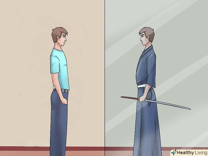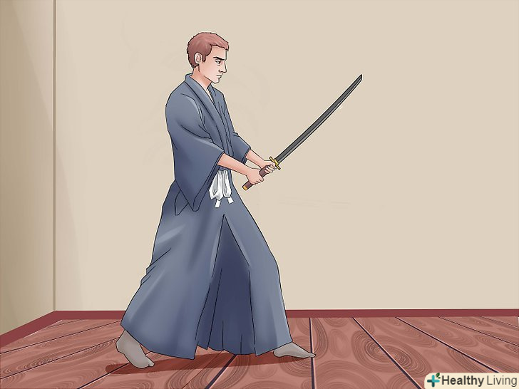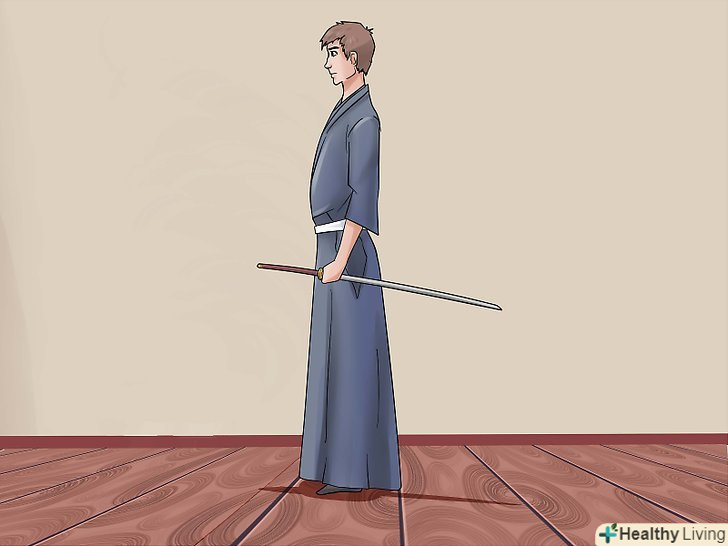 Твердо стійте на ногах (як ніби стоїте з друзями, тільки ваші плечі повинні бути на лінії з стегнами, а спина рівна), ноги повинні бути на ширині плечей.- Візьміть меч (все ще в футлярі) в ліву руку, лезо вгору (кривої, спрямованої вгору, від себе) і від верхньої частини сайя (футляр). Підніміть його з лівого боку, як ніби він був у Вашому Обі (пояс).