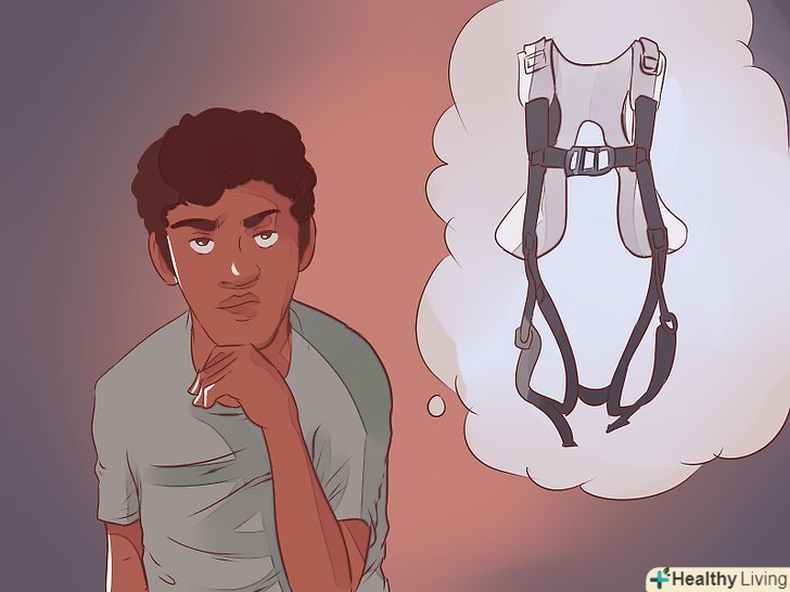 Почитайте про спорядження. існує безліч варіантів екіпіровки для банджі-джампінгу, але найбільш поширені обв'язки для корпусу і для ніг. Ножні обхвати будуть прив'язані до обох ваших щиколоток і у вас буде додаткова страхувальна мотузка (для тіла ж використовується звичайна скелелазна обв'язка, так звана "альтанка").- "альтанка" забезпечить більшу свободу рухів, крім того, вона буде добре підтримувати спину. Якщо ви збираєтеся стрибати в скелелазній обв'язці, переконайтеся, що у неї будуть плечові обхвати, щоб підтримати ваш корпус цілком. [1]