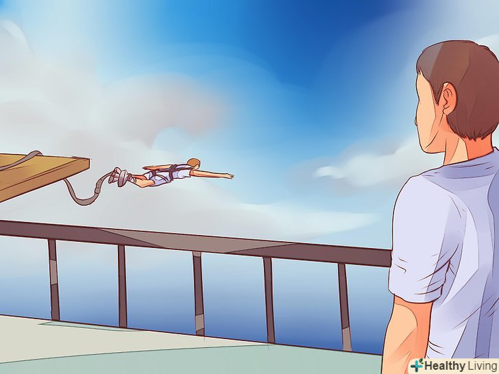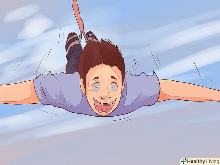 Подумайте про те, як ви будете стрибати. існує безліч варіантів стрибків, але найкращим варіантом для новачка буде стрибок "ластівкою". Ви повинні будете сильно відштовхнутися від платформи і полетіти, розкинувши руки в сторони немов птах. До того часу, як ви досягнете нижньої точки стрибка, ви повинні будете дивитися прямо вниз, в той час як канати будуть плавно гальмувати.- Інші варіанти стрибків: сальто назад, стрибок через перила (чимось схожий на стрибок "ластівкою", тільки в даному випадку ви перестрибуєте через перила моста), стрибок "летюча миша" (ви висите вниз головою на краї платформи, тримаючись тільки ступнями, а потім просто падаєте вниз), ліфт (стрибок ногами вперед, але це може бути чревате переломом щиколотки) і тандем (стрибаєте удвох з ще однією людиною). [1]