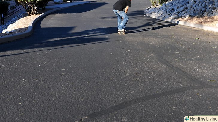 - Спробуйте пригальмувати ногою об землю. Це один з найпростіших і дієвий способів загальмувати, якщо немає місця для карвінгу. Зістрибувати з дошки потрібно тільки в крайньому випадку, якщо не можете контролювати набір швидкості. Якщо ви вирішили зістрибнути, намагайтеся вибирати місце, щоб приземлитися на траву і перекотитися. Якщо ви хочете зупинитися швидко, спробуйте загальмувати хвостом дошки. Перенесіть вагу назад, також як і при виконанні трюку менуал, тільки притисніть задню частину дошки до землі.