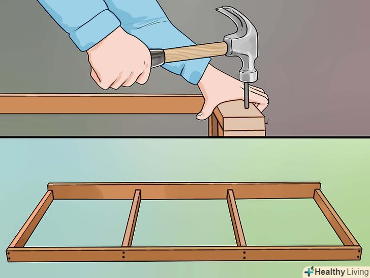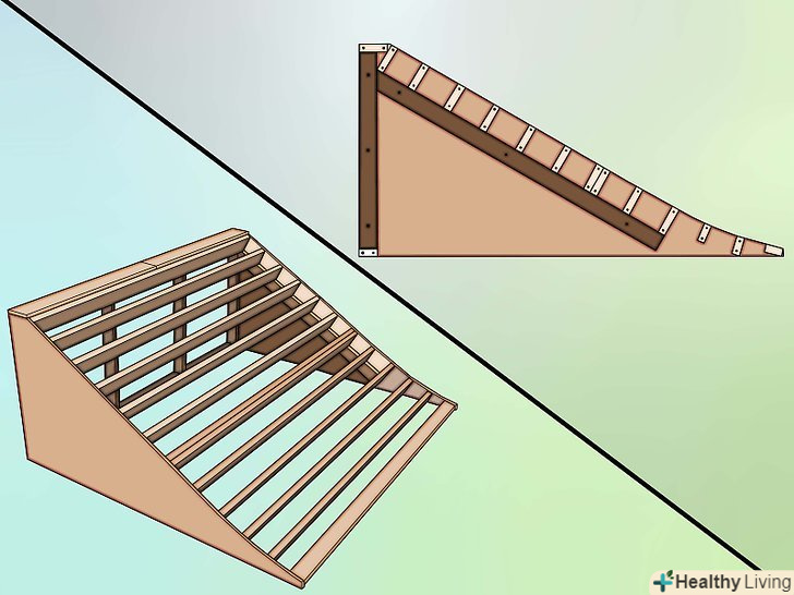 Зберіть каркас рампи. почавши роботу з нижньої поперечини задньої стінки каркаса, прибийте до неї цвяхами чотири вертикальних опорних бруска, зображених на вашому кресленні. Не економте на цвяхах, так як кожен цвях надає каркасу додаткову міцність. Після закріплення всіх чотирьох вертикальних брусків прикладіть до них з іншого краю верхню поперечину і також прибийте її. [13]- Скріпіть боковини рампи між собою задньою стінкою каркаса і його передньою поперечиною. На цьому етапі дуже важливо переконатися в тому, що все вийшло рівно, так як якщо каркас вийшов кривим зараз, потім рампу ніяк не вийде вирівняти.
