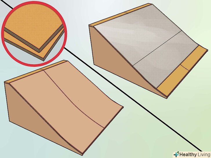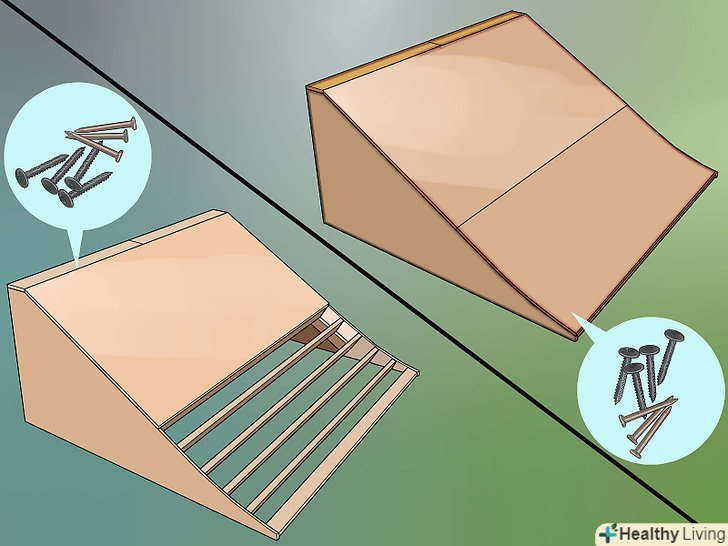 - Для рампи з горизонтальним верхом можна взяти за основу міцний ящик або схожу на стіл конструкцію і обшити її фанерою. Забезпечте додаткову опору для верхньої поверхні і підпори для ската. З обережністю з'єднуйте горизонтальну частину рампи з зігнутим скатом і його дзеркальним відображенням - "пасткою".