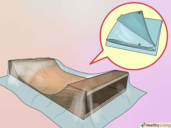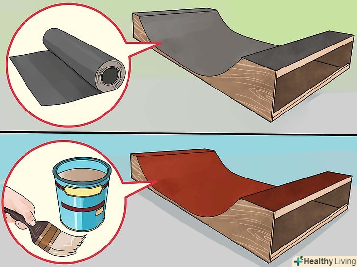 Забезпечте скат рампи захистом. незалежно від того, чи використовували ви високоякісний матеріал Skatelite або менш витратну фанеру, обов'язково захищайте рампу від впливу погодних умов.- Матеріал Skatelite стійкий до впливу сонячних променів і дощу, але якщо ви підкладіть під нього толь, то він захистить розташовану нижче фанеру від вологи, яка може просочитися вниз через щілини. [23]