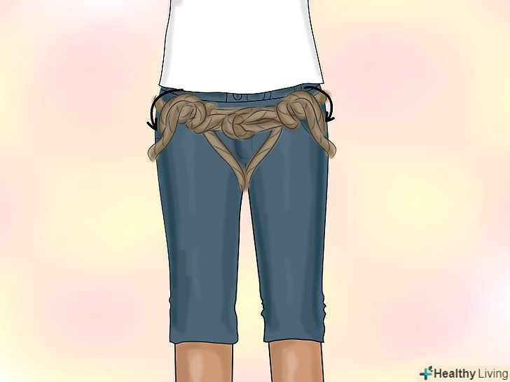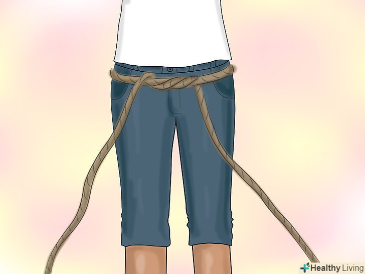 Переплетіть кінці мотузки, щоб вона обв'язала вас по талії. кінці мотузки повинні переплітатися навколо один одного, щоб утворився вузол внахлест. Повторіть цю дію, щоб мотузка двічі обвилася навколо себе. Фактично це буде місце, куди буде прикріплений карабін. Він не дозволить мотузці затиснути чоловічу гідність (якщо воно у вас є). Вільні кінці мотузки відпустіть, щоб вони звисали спереду вас (швидше за все дістаючи землі).