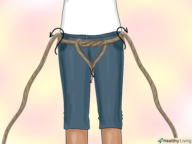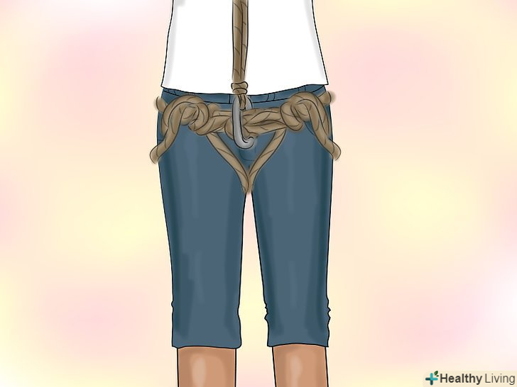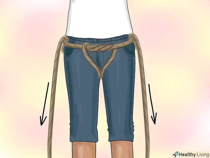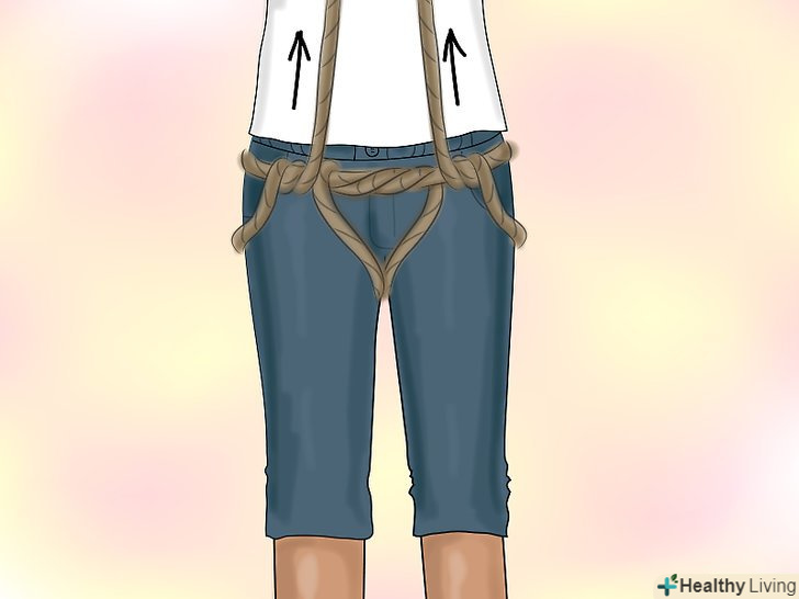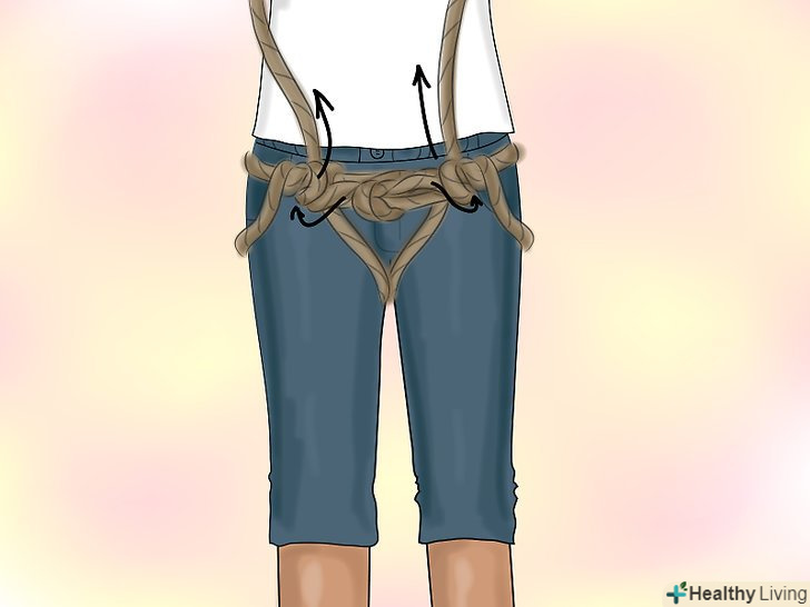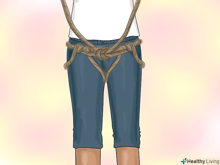 Потягніть кінці, присівши навпочіпки. це важливий крок, оскільки ця процедура допоможе затягнути обв'язку. Встаньте і сядьте навпочіпки кілька разів, весь цей час тягніть за вільні кінці мотузки. Ви повинні відчути, як мотузка стискає Вас між ніг-переконайтеся, що ключові частини тіла не знаходяться між мотузкою і вашою ногою.