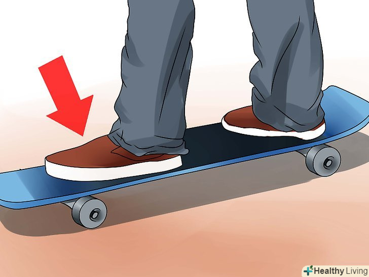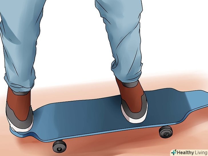 Станьте в основну позицію. поставте свої ноги між болтами, які тримають підвіски, трохи більше ширини плечей. Нахиліть свою направляючу ногу трохи вперед, приблизно під кутом 45 градусів. Другу ногу поставте перпендикулярно дошці і напрямку, в якому ви рухаєтеся.- Це тільки одна з позицій, яку Ви можете використовувати. Після освоєння базової позиції, ви можете вивчити інші, які можливо підійдуть вам більше. Катайтеся так, як Вам зручно.