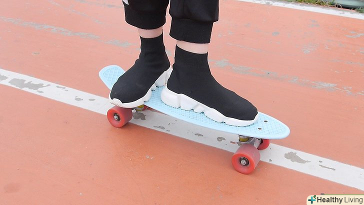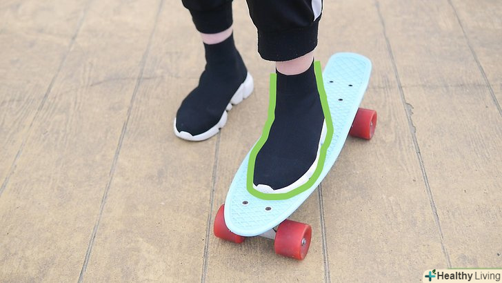 Поставте ліву чи праву ногу вперед на дошку (вам повинно бути зручно) між двома гвинтами, за допомогою яких підвіски (траки) кріпляться до дошки. цією ногою ви не будете відштовхуватися - вона завжди буде попереду для збереження рівноваги. Ви повинні стояти обличчям вперед.- Деяким любителям дощок більше подобається відштовхуватися передньою ногою. При такому стилі їзди одна нога весь час залишається на дошці ззаду, а не попереду. [1]