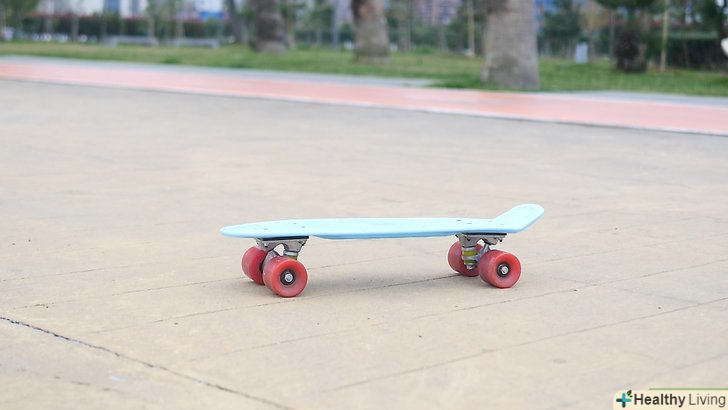 Поставте дошку на рівну поверхню. це особливо важливо, якщо ви раніше не каталися на скейтборді. Рівна поверхня дозволить вам впевненіше триматися на дошці - вона не буде скочуватися в сторону.- Щоб дошка не рухалася, поставте її на гравій або траву. На гравії падати буде болючіше, проте на такій поверхні дошка буде стійкіше, що буде корисно, поки ви вчитеся.
