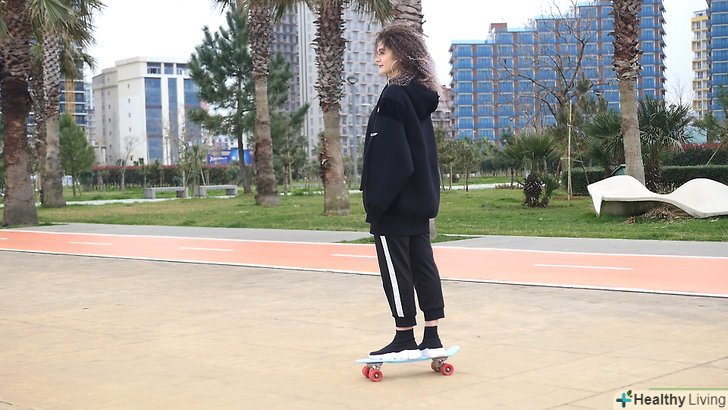 - Спробуйте їхати накатом. коли розвинете достатню швидкість і будете почувати себе впевнено, поставте ту ногу, якою ви відштовхувалися, на задню частину дошки. Тепер можна буде повертати корпус і ступні в різні боки, щоб задати потрібний напрямок руху.