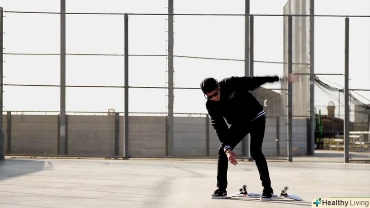 - Зрушуйте в положення їзди. коли ви рухаєтеся, необхідно перемістити їздову ногу в сторону. Це більше схоже на те, як ви стояли, коли дошка була ще на траві. Підніміть штовхає ногу і акуратно поставте її на задню частину дошки. Коліна повинні бути злегка зігнуті, але ви повинні бути в цілому у вертикальному положенні, з прямою спиною, щоб навчитися балансувати. [2]
