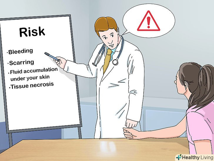 Ознайомтеся з ризиками. оскільки підтяжка живота є хірургічною операцією, вона супроводжується операційними ризиками: місце розрізу може запалитися і продовжувати кровоточити. Або у вас може виникнути реакція на наркоз. Також є ризики, пов'язані безпосередньо з підтяжкою живота: шрами, скупчення рідини під шкірою або некроз тканин, коли тканина пошкоджується і відмирає. [10]- Поговоріть з хірургом про ймовірність виникнення цих ризиків у вашому випадку.