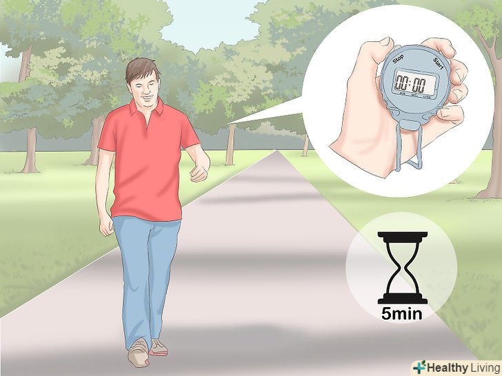 Встановіть таймер. перед першою прогулянкою визначте, скільки часу ви будете ходити. Виберіть такий час, протягом якого ви точно зможете ходити. Не переживайте, якщо це не дуже довго, просто продовжуйте ходити і воно буде збільшуватися. Відмінний початок - 2-5 хвилин кожен день, і цей час буде збільшуватися щотижня.- Не звертайте уваги на відстань. Більше значення відіграє тривалість ходьби. З досвідом ви будете ходити швидше і на більшу відстань.