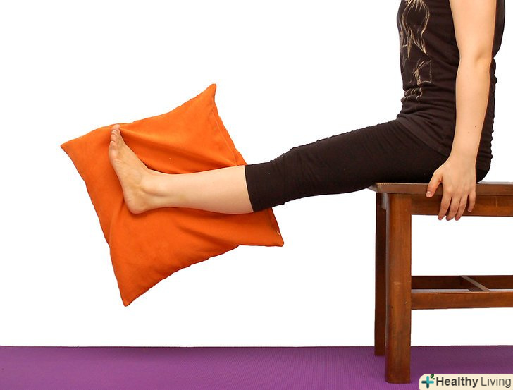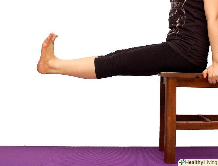 Зробіть вправи різноманітними, додавши інші елементи до них.- Сидячи на краю стільця, виконайте махи ногами. Швидко підніміть ногу вгору, не згинаючи її при цьому. Дотримуйтеся за стілець для балансу. Повторіть махи 5 - 10 разів, змініть ногу.