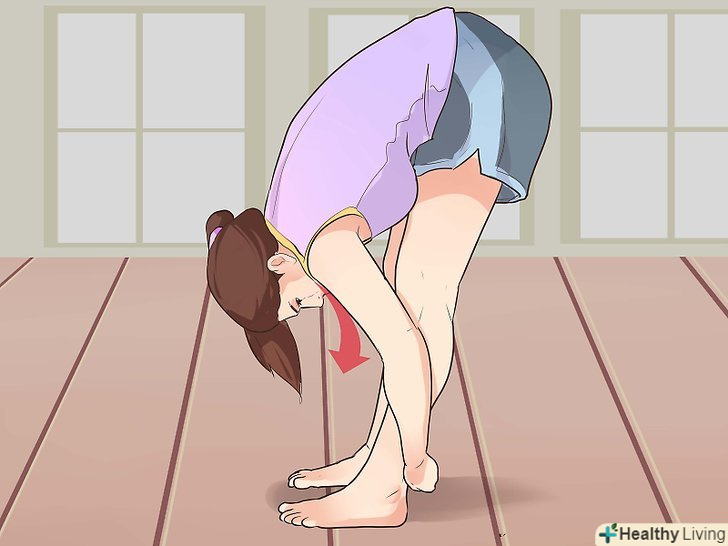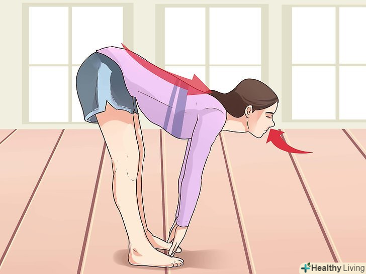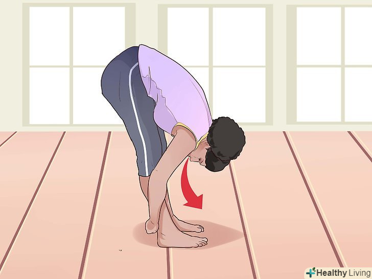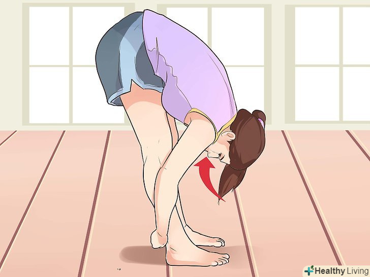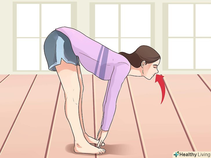 З видихом нахиліться вперед до ніг. зробіть видих і опустіть корпус до прямих ніг. Ця поза називається Уттанасана. [13]- Тут дуже важливо зберігати спину рівною і згинатися не попереком, а в тазостегновому суглобі, коли ви переходите від Урдхва Хастансани в Уттанасану. Так ви не забудете, що потрібно залишати грудну клітку в області серця не затиснутою. [14]