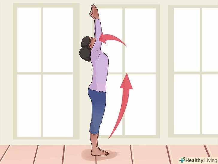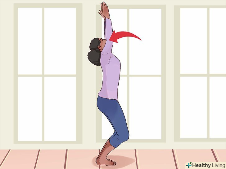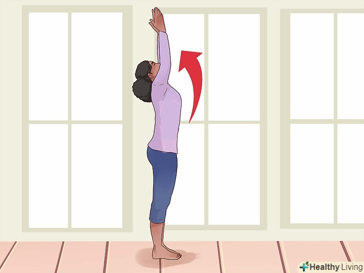 Підніміть руки зі складеними долонями вгору. як тільки ви вирішите, чому буде присвячена ця практика, зробіть глибокий вдих і підніміть руки вгору до стелі, увійшовши в позу Урдхва Хастасана (поза гори з витягнутими вгору руками). [9] М'яко прогніться назад, спрямовуючи погляд вгору слідом за руками.- Постарайтеся повністю випрямити лікті і тягнутися пальцями рук вгору до стелі. Чи не відкидайте голову сильно назад, щоб не стискати шийний відділ хребта. [10]